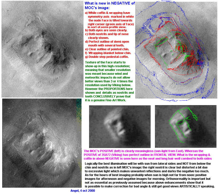 5) Dr. Lahoz published monograph: "Sacred Martian Face = Sagrada Faz Marciana" (UNIAM, dec-2000) explaining in every detail the riddle of the Face, but, unaware of Ignatius' publication, he said in there that Dr. Van Flandern had firstly announced 'conclusive evidence' of Fine-Art (artificiality) in the Face. Now such priority case is here corrected; and the work of Kelly-Fleming-Van Flandern remains moderately respected since the negative was used anyway, even for the wrong purpose of pretending a SYMMETRIC Face-Mesa. Such symmetry is not there as already explained. 6) Dr. Lahoz gave artistic interpretation of both intended Art-Faces (sunset and sunrise respectively). Above picture does not need more comments. There is, conclusively, extraordinary Fine-Art and Craft in the Face-mesa. |